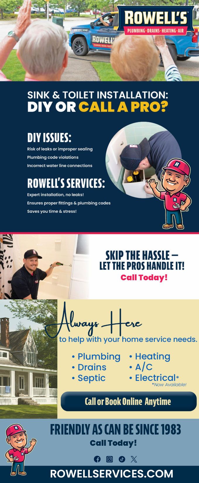 "Friendly As Can Be Since 1983!" When you need help with your plumbing, drains, heating, cooling or electrical in Carroll, you can always rely on Rowell's Services! Call us now or book online!